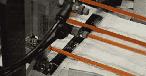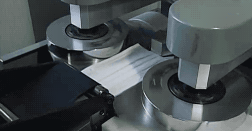 ↑口罩主体层叠结构是机械设定好小斜角,由左到右逐渐变窄的归拢出来的,然后用压片把口罩表面压平整